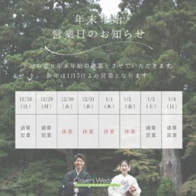 本年もClover’s Wedding SALONをご愛顧いただきまして誠にありがとうございました。 誠に勝手ながら下記の期間を年末年始休…